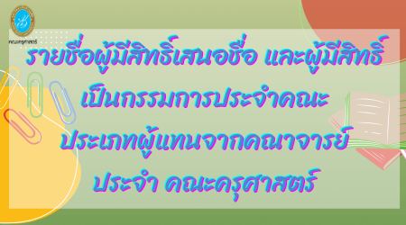 ประกาศคณะครุศาสตร์ เรื่อง รายชื่อผู้มีสิทธิ์ได้รับการคัดเลือกเป็นกรรมการประจำคณะ ประเภทผู้แทนจากคณาจารย์ประจำ คณะครุศาสตร์Read More ประกาศคณะครุศาสตร์ เรื่อง รายชื่อผู้มีสิทธิ์ได้รับการคัดเลือกเป็นกรรมการประจำคณะ ประเภทผู้แทนจากคณาจารย์ประจำ คณะครุศาสตร์
