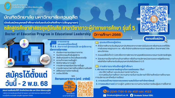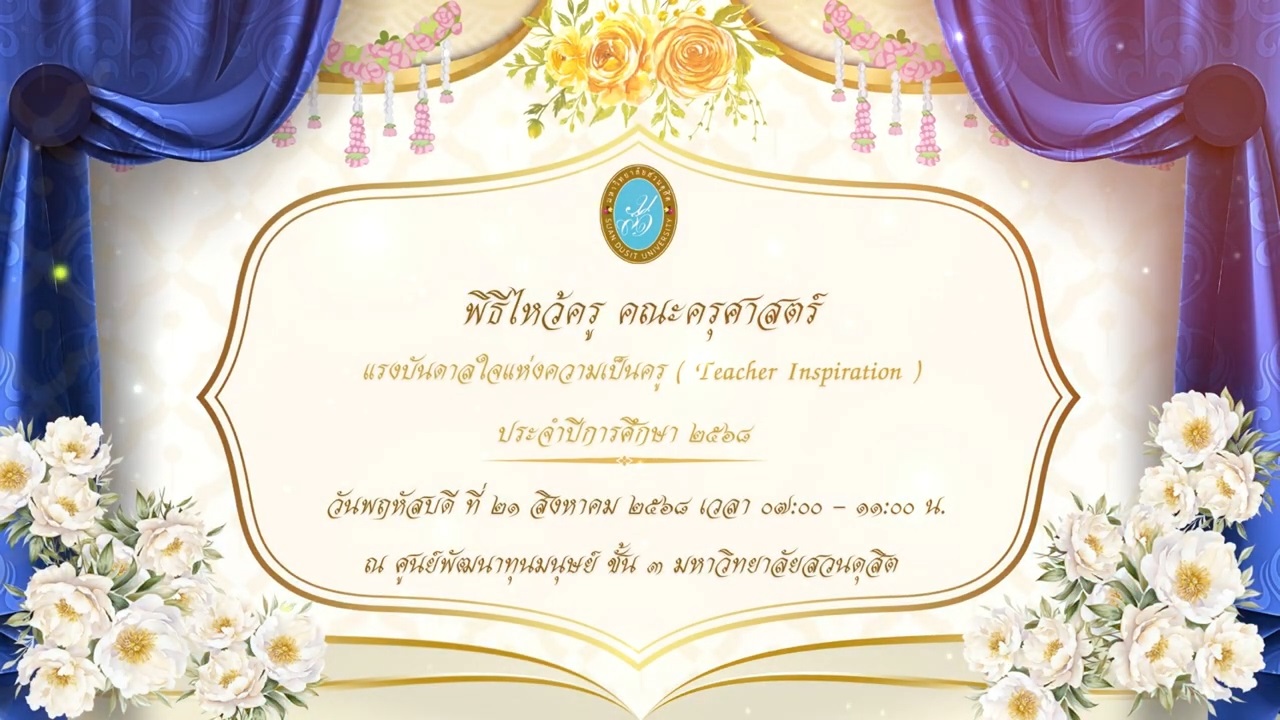 ข่าวประชาสัมพันธ์ รายชื่อผู้มีสิทธิ์เสนอชื่อ และผู้มีสิทธิ์เป็นกรรมการประจำคณะ ประเภทผู้แทนจากคณาจารย์ประจำ คณะครุศาสตร์Read More รายชื่อผู้มีสิทธิ์เสนอชื่อ และผู้มีสิทธิ์เป็นกรรมการประจำคณะ ประเภทผู้แทนจากคณาจารย์ประจำ คณะครุศาสตร์ประกาศคณะครุศาสตร์ เรื่อง รายชื่อผู้มีสิทธิ์ออกเสียงเลือกตั้งกรรมการประจำคณะ ประเภทผู้แทนจากคณาจารย์ประจำ คณะครุศาสตร์Read More ประกาศคณะครุศาสตร์ เรื่อง รายชื่อผู้มีสิทธิ์ออกเสียงเลือกตั้งกรรมการประจำคณะ ประเภทผู้แทนจากคณาจารย์ประจำ คณะครุศาสตร์ประกาศคณะครุศาสตร์ เรื่อง รายชื่อผู้มีสิทธิ์ได้รับการคัดเลือกเป็นกรรมการประจำคณะ ประเภทผู้แทนจากคณาจารย์ประจำ คณะครุศาสตร์Read More ประกาศคณะครุศาสตร์ เรื่อง รายชื่อผู้มีสิทธิ์ได้รับการคัดเลือกเป็นกรรมการประจำคณะ ประเภทผู้แทนจากคณาจารย์ประจำ คณะครุศาสตร์ อ่านทั้งหมด ปรัชญาของคณะครุศาสตร์ “สร้างครูดี มียุทธศาสตร์ ฉลาดให้ภูมิปัญญา มุ่งพัฒนาสู่ความเป็นสากล” ปริญญาตรี ปริญญาโท ปริญญาเอก ประกาศนียบัตรวิชาชีพ ข่าวกิจกรรม อ่านทั้งหมด ข่าวกิจกรรม ผศ.ดร.วีณัฐ สกุลหอม คณบดีคณะครุศาสตร์ มหาวิทยาลัยสวนดุสิต เป็นประธานการประชุมคณะกรรมการประจำคณะครุศาสตร์ ครั้งที่ 6/2568ฝ่ายฝึกประสบการณ์วิชาชีพครู คณะครุศาสตร์ มหาวิทยาลัยสวนดุสิต จัดนิทรรศการการปฏิบัติการสอนในสถานศึกษา 1 หลักสูตรศึกษาศาสตรบัณฑิต (หลักสูตร 4 ปี) สาขาวิชาการศึกษาปฐมวัย และสาขาวิชาการประถมศึกษา ภาคการศึกษาที่ 1/2568ดร.พันธรักษ์ ผูกพันธุ์ ผู้ช่วยอธิการบดีฝ่ายพัฒนาการเรียนการสอนสู่สากล กล่าวต้อนรับคณะผู้บริหารจากกรมการศึกษาประจำเขตเมืองอิมุส สาธารณรัฐฟิลิปปินส์คณะครุศาสตร์ มหาวิทยาลัยสวนดุสิต จัดประชุมบุคลากรคณะครุศาสตร์ หลังรับมอบนโยบายในขับเคลื่อนการดำเนินงาน และการพัฒนาบุคลากร พร้อมทั้งเชื่อมโยงโรงเรียนสาธิตละอออุทิศคณะครุศาสตร์ ร่วมกับ กองพัฒนานักศึกษา จัดกิจกรรมเวทีเฟื่องฟ้า “ร้อง เต้น เล่น เรียนรู้” ในโครงการ SDGs ครูสร้างสื่อดิจิทัล: นวัตกรรมการเรียนรู้เพื่อโลกที่ยั่งยืนคณะครุศาสตร์ มหาวิทยาลัยสวนดุสิต จัดโครงการขยายผลการนำต้นแบบสหกิจศึกษาคณะครุศาสตร์สู่สถานศึกษาขั้นพื้นฐานในเครือข่าย กิจกรรมที่ 3 การสัมมนาแลกเปลี่ยนประสบการณ์ระหว่างคณะครุศาสตร์กับสถานศึกษาขั้นพื้นฐาน ในหัวข้อ “เปลี่ยนการสอน…สร้างนักคิด : ห้องเรียนสร้างสรรค์สู่ศตวรรษที่ 21” อ่านทั้งหมด YouTubeEDU Suandusit FacebookEDUSuandusit TikTok@edusuandusit E-mail edusuandusit.2021@gmail.com คณะครุศาสตร์ สำนักงานคณะครุศาสตร์ 022445502 สายด่วนคณบดี 022445503 ห