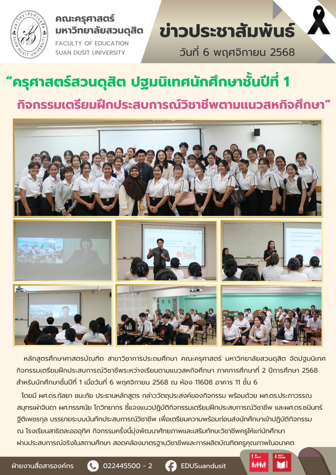 ข่าวกิจกรรม ปรัชญาของคณะครุศาสตร์ “สร้างครูดี มียุทธศาสตร์ ฉลาดให้ภูมิปัญญา มุ่งพัฒนาสู่ความเป็นสากล” ปริญญาตรี ปริญญาโท ปริญญาเอก ประกาศนียบัตรวิชาชีพ ข่าวประชาสัมพันธ์ รายชื่อผู้มีสิทธิ์เสนอชื่อ และผู้มีสิทธิ์เป็นกรรมการประจำคณะ ประเภทผู้แทนจากคณาจารย์ประจำ คณะครุศาสตร์Read More รายชื่อผู้มีสิทธิ์เสนอชื่อ และผู้มีสิทธิ์เป็นกรรมการประจำคณะ ประเภทผู้แทนจากคณาจารย์ประจำ คณะครุศาสตร์ประกาศคณะครุศาสตร์ เรื่อง รายชื่อผู้มีสิทธิ์ออกเสียงเลือกตั้งกรรมการประจำคณะ ประเภทผู้แทนจากคณาจารย์ประจำ คณะครุศาสตร์Read More ประกาศคณะครุศาสตร์ เรื่อง รายชื่อผู้มีสิทธิ์ออกเสียงเลือกตั้งกรรมการประจำคณะ ประเภทผู้แทนจากคณาจารย์ประจำ คณะครุศาสตร์ประกาศคณะครุศาสตร์ เรื่อง รายชื่อผู้มีสิทธิ์ได้รับการคัดเลือกเป็นกรรมการประจำคณะ ประเภทผู้แทนจากคณาจารย์ประจำ คณะครุศาสตร์Read More ประกาศคณะครุศาสตร์ เรื่อง รายชื่อผู้มีสิทธิ์ได้รับการคัดเลือกเป็นกรรมการประจำคณะ ประเภทผู้แทนจากคณาจารย์ประจำ คณะครุศาสตร์ อ่านทั้งหมด YouTubeEDU Suandusit FacebookEDUSuandusit TikTok@edusuandusit E-mail edusuandusit.2021@gmail.com คณะครุศาสตร์ สำนักงานคณะครุศาสตร์ 022445502 สายด่วนคณบดี 022445503 หลักสูตรศึกษาศาสตรบัณฑิต สาขาวิชาการศึกษาปฐมวัย 022445504 สาขาวิชาการประถมศึกษา 022445500 หลักสูตรศึกษาศาสตรมหาบัณฑิต สาขาวิชาการจัดการการศึกษาปฐมวัยและประถมศึกษา022445504 สาขาวิชาการสอนภาษาอังกฤษระดับประถมศึกษา022445507 หลักสูตรประกาศนียบัตรบัณฑิต สาขาวิชาล่ามภาษามือ022445530 หลักสูตรประกาศนียบัตรบัณฑิตวิชาชีพครู022445502 Play ครุศาสตร์ น้อมวันทา บูชาครู 2568 Play อบรมเชิงปฏิบัติการ “การยกระดับการเรียนการสอนยุคใหม่ด้วย AI” ให้กับผู้บริหารและครูโรงเรียนวัดโพธิ์ Play โครงการพัฒนาความรู้ให้แก่บุตรของการทางพิเศษแห่งประเทศไทย ระหว่างปิดภาคเรียน ปี 2568