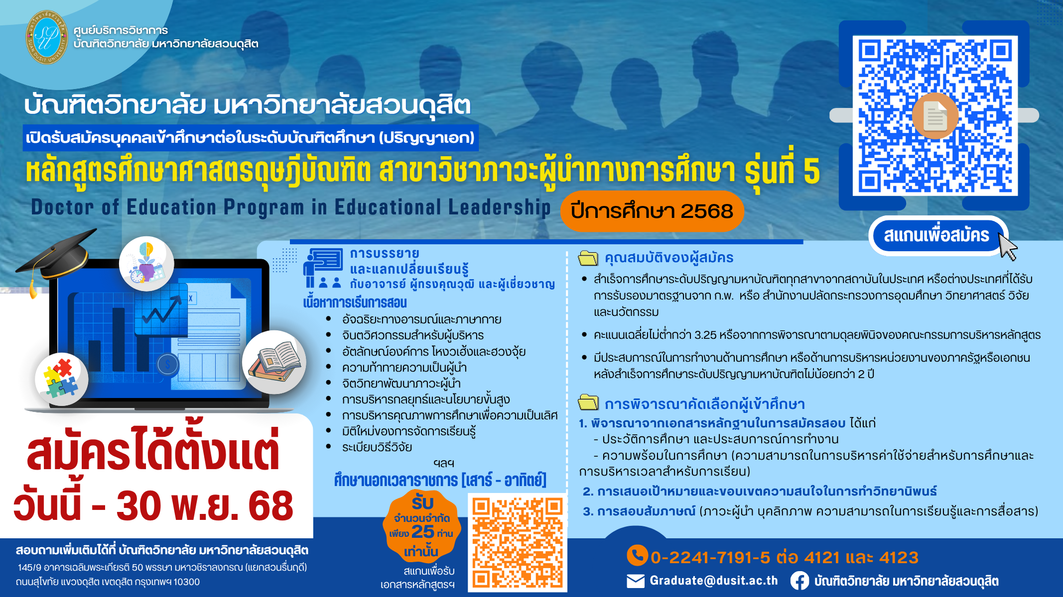 ข่าวกิจกรรม ดูทั้งหมด ปรัชญาของคณะครุศาสตร์ “สร้างครูดี มียุทธศาสตร์ ฉลาดให้ภูมิปัญญา มุ่งพัฒนาสู่ความเป็นสากล” ปริญญาตรี ปริญญาโท ปริญญาเอก ประกาศนียบัตรวิชาชีพ ข่าวประชาสัมพันธ์ รายชื่อผู้มีสิทธิ์เสนอชื่อ และผู้มีสิทธิ์เป็นกรรมการประจำคณะ ประเภทผู้แทนจากคณาจารย์ประจำ คณะครุศาสตร์Read More รายชื่อผู้มีสิทธิ์เสนอชื่อ และผู้มีสิทธิ์เป็นกรรมการประจำคณะ ประเภทผู้แทนจากคณาจารย์ประจำ คณะครุศาสตร์ประกาศคณะครุศาสตร์ เรื่อง รายชื่อผู้มีสิทธิ์ออกเสียงเลือกตั้งกรรมการประจำคณะ ประเภทผู้แทนจากคณาจารย์ประจำ คณะครุศาสตร์Read More ประกาศคณะครุศาสตร์ เรื่อง รายชื่อผู้มีสิทธิ์ออกเสียงเลือกตั้งกรรมการประจำคณะ ประเภทผู้แทนจากคณาจารย์ประจำ คณะครุศาสตร์ประกาศคณะครุศาสตร์ เรื่อง รายชื่อผู้มีสิทธิ์ได้รับการคัดเลือกเป็นกรรมการประจำคณะ ประเภทผู้แทนจากคณาจารย์ประจำ คณะครุศาสตร์Read More ประกาศคณะครุศาสตร์ เรื่อง รายชื่อผู้มีสิทธิ์ได้รับการคัดเลือกเป็นกรรมการประจำคณะ ประเภทผู้แทนจากคณาจารย์ประจำ คณะครุศาสตร์ อ่านทั้งหมด YouTubeEDU Suandusit FacebookEDUSuandusit TikTok@edusuandusit E-mail edusuandusit.2021@gmail.com คณะครุศาสตร์ สำนักงานคณะครุศาสตร์ 022445502 สายตรงคณบดี 022445503 หลักสูตรศึกษาศาสตรบัณฑิต การศึกษาปฐมวัย 022445504 การประถมศึกษา 022445500 หลักสูตรศึกษาศาสตรมหาบัณฑิต การจัดการการศึกษาปฐมวัยและประถมศึกษา022445504 การสอนภาษาอังกฤษระดับประถมศึกษา022445507 หลักสูตรประกาศนียบัตรบัณฑิต ล่ามภาษามือ022445530 ประกาศนียบัตรบัณฑิตวิชาชีพครู022445502 Play ครุศาสตร์ น้อมวันทา บูชาครู 2568 Play อบรมเชิงปฏิบัติการ “การยกระดับการเรียนการสอนยุคใหม่ด้วย AI” ให้กับผู้บริหารและครูโรงเรียนวัดโพธิ์ Play โครงการพัฒนาความรู้ให้แก่บุตรของการทางพิเศษแห่งประเทศไทย ระหว่างปิดภาคเรียน ปี 2568