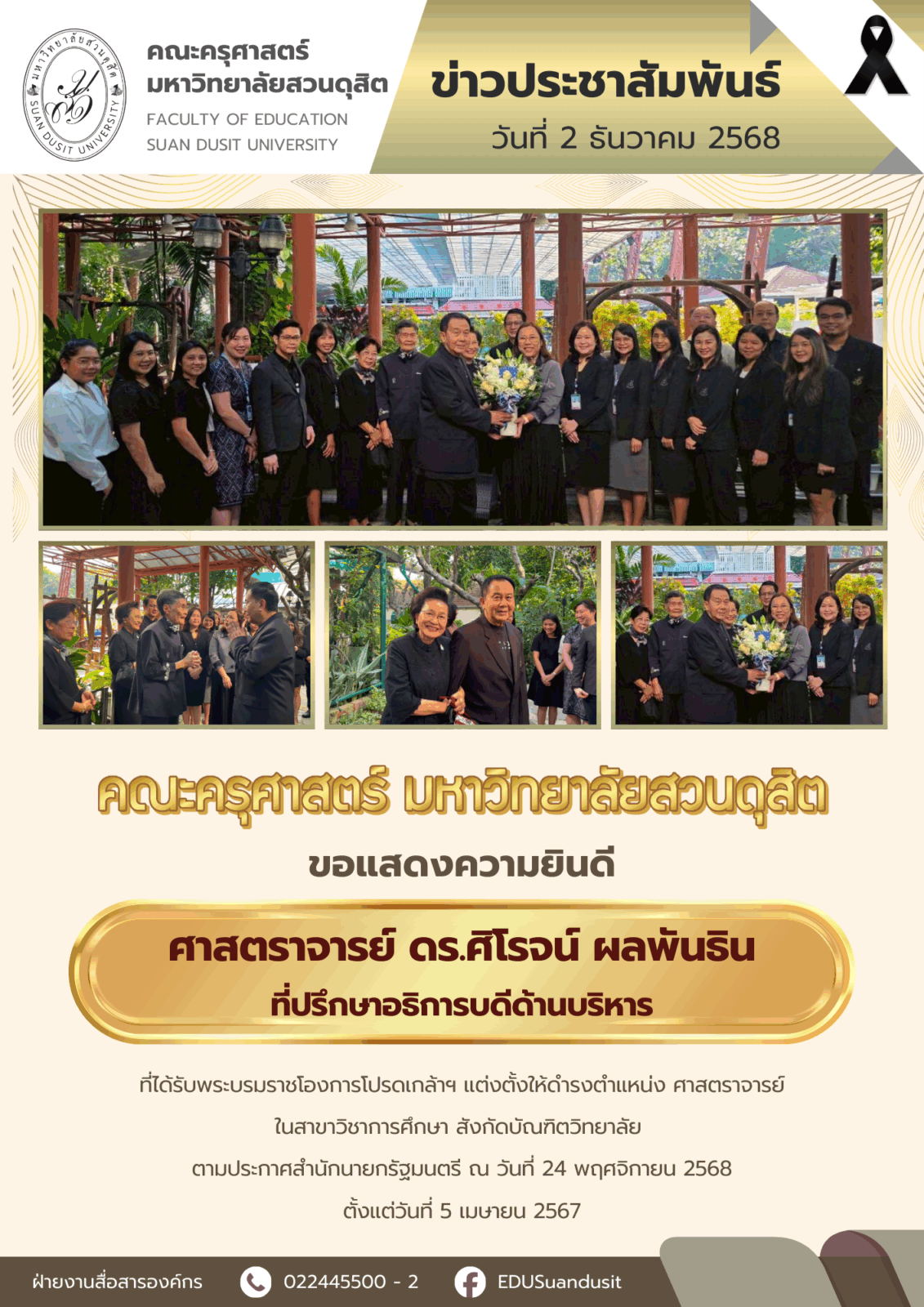ข่าวกิจกรรม ดูเพิ่มเติม ปรัชญาของคณะครุศาสตร์ “สร้างครูดี มียุทธศาสตร์ ฉลาดให้ภูมิปัญญา มุ่งพัฒนาสู่ความเป็นสากล” ปริญญาตรี ปริญญาโท ปริญญาเอก ประกาศนียบัตรวิชาชีพ ข่าวประชาสัมพันธ์ รายชื่อผู้มีสิทธิ์เสนอชื่อ และผู้มีสิทธิ์เป็นกรรมการประจำคณะ ประเภทผู้แทนจากคณาจารย์ประจำ คณะครุศาสตร์Read More รายชื่อผู้มีสิทธิ์เสนอชื่อ และผู้มีสิทธิ์เป็นกรรมการประจำคณะ ประเภทผู้แทนจากคณาจารย์ประจำ คณะครุศาสตร์ประกาศคณะครุศาสตร์ เรื่อง รายชื่อผู้มีสิทธิ์ออกเสียงเลือกตั้งกรรมการประจำคณะ ประเภทผู้แทนจากคณาจารย์ประจำ คณะครุศาสตร์Read More ประกาศคณะครุศาสตร์ เรื่อง รายชื่อผู้มีสิทธิ์ออกเสียงเลือกตั้งกรรมการประจำคณะ ประเภทผู้แทนจากคณาจารย์ประจำ คณะครุศาสตร์ประกาศคณะครุศาสตร์ เรื่อง รายชื่อผู้มีสิทธิ์ได้รับการคัดเลือกเป็นกรรมการประจำคณะ ประเภทผู้แทนจากคณาจารย์ประจำ คณะครุศาสตร์Read More ประกาศคณะครุศาสตร์ เรื่อง รายชื่อผู้มีสิทธิ์ได้รับการคัดเลือกเป็นกรรมการประจำคณะ ประเภทผู้แทนจากคณาจารย์ประจำ คณะครุศาสตร์ อ่านทั้งหมด YouTubeEDU Suandusit FacebookEDUSuandusit TikTok@edusuandusit E-mail edusuandusit.2021@gmail.com คณะครุศาสตร์ สำนักงานคณะครุศาสตร์ 022445502 สายตรงคณบดี 022445503 หลักสูตรศึกษาศาสตรบัณฑิต การศึกษาปฐมวัย 022445504 การประถมศึกษา 022445500 หลักสูตรศึกษาศาสตรมหาบัณฑิต การจัดการการศึกษาปฐมวัยและประถมศึกษา022445504 การสอนภาษาอังกฤษระดับประถมศึกษา022445507 หลักสูตรประกาศนียบัตรบัณฑิต ล่ามภาษามือ022445530 ประกาศนียบัตรบัณฑิตวิชาชีพครู022445502 Play ครุศาสตร์ น้อมวันทา บูชาครู 2568 Play อบรมเชิงปฏิบัติการ “การยกระดับการเรียนการสอนยุคใหม่ด้วย AI” ให้กับผู้บริหารและครูโรงเรียนวัดโพธิ์ Play โครงการพัฒนาความรู้ให้แก่บุตรของการทางพิเศษแห่งประเทศไทย ระหว่างปิดภาคเรียน ปี 2568