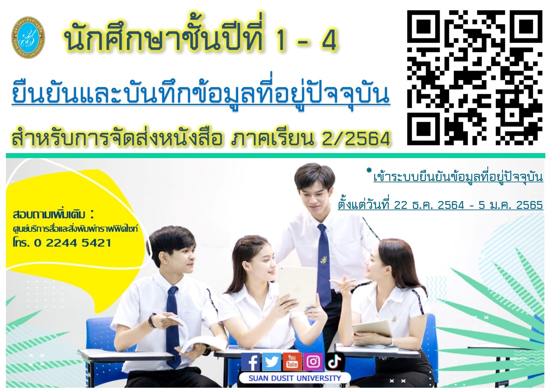 ศูนย์บริการสื่อและสิ่งพิมพ์กราฟฟิคไซท์ ขอความร่วมมือนักศึกษาชั้นปีที่ 1-4 ยืนยันและบันทึกที่อยู่ปัจจุบัน สำหรับการจัดส่งหนังสือเรียนให้กับนักศึกษา ภาคเรียน 2/2564 สามารถเข้าระบบยืนยันได้ตั้งแต่วันที่ 22 ธันวาคม 2564 – 5 มกราคม 2565 บันทึกที่อยู่ได้ที่ https://forms.gle/X9XJRSGBGGaraXks7
