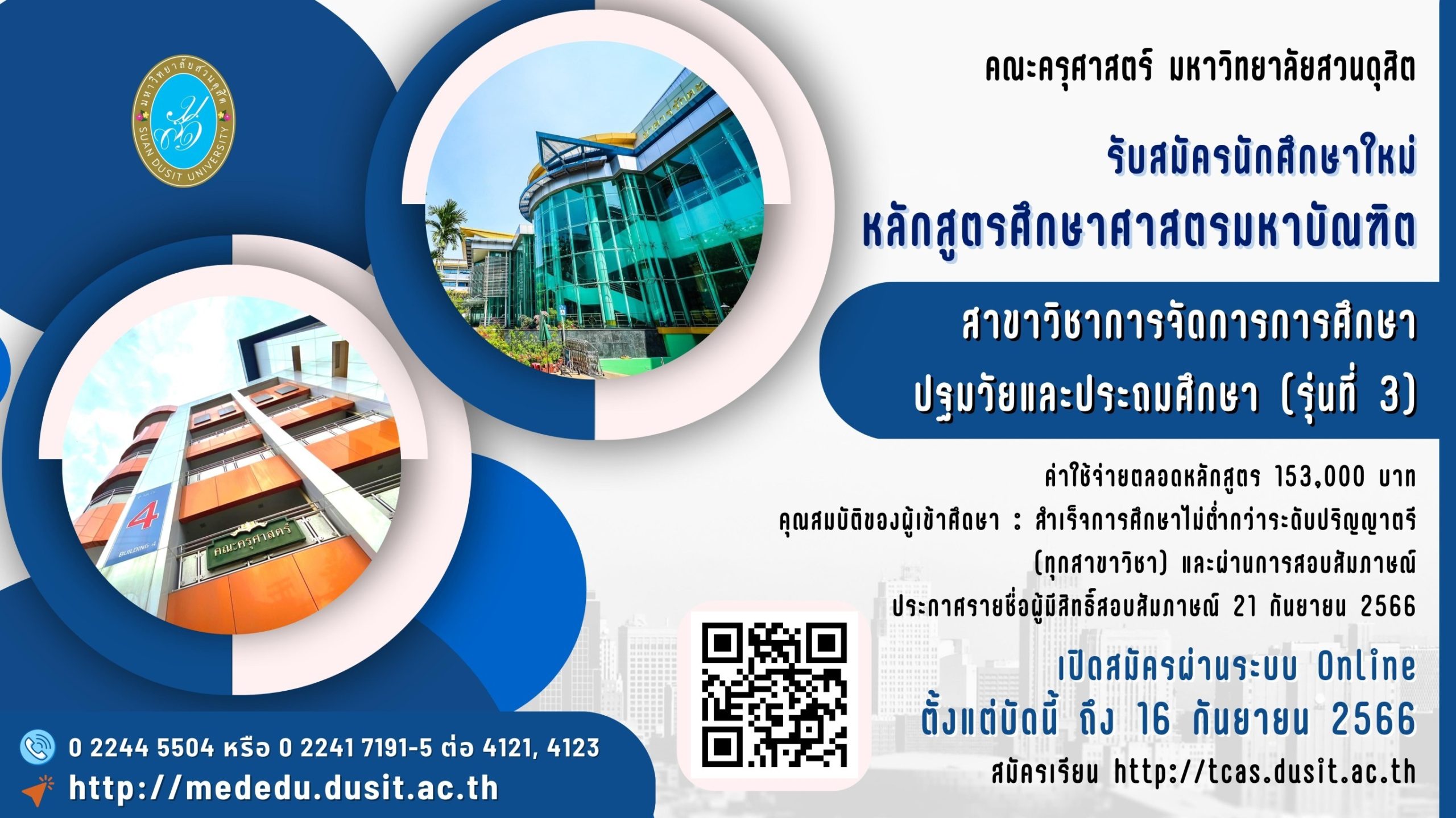 [vc_row][vc_column][vc_column_text]การรับสมัครและการคัดเลือกบุคคลเข้าศึกษาระดับบัณฑิตศึกษาหลักสูตรศึกษาศาสตรมหาบัณฑิต สาขาวิชาการจัดการการศึกษาปฐมวัยและประถมศึกษาหลักสูตรใหม่ พ.ศ. ๒๕๖๕ (รุ่นที่ ๓) ประจำปีการศึกษา ๒๕๖๖ (click)[/vc_column_text][/vc_column][/vc_row][vc_row][vc_column][vc_single_image image=”8673″ alignment=”center” onclick=”custom_link” link=”https://tcas.dusit.ac.th/”][/vc_column][/vc_row]