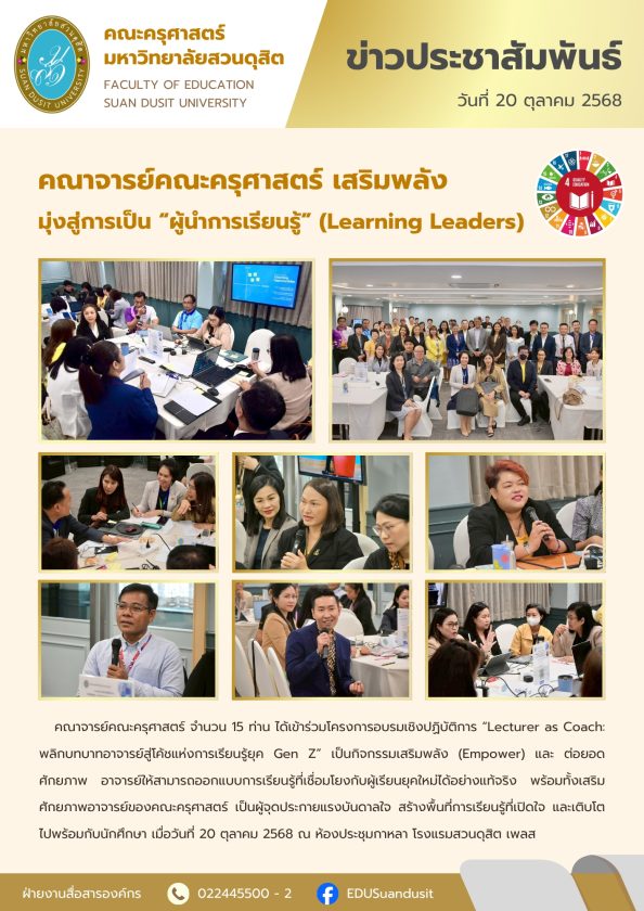 20 ต.ค. 2568 – อบรมเชิงปฏิบัติการ “Lecturer as Coach : พลิกบทบาทอาจารย์สู่โค้ชแห่งการเรียนรู้ยุค Gen Z”