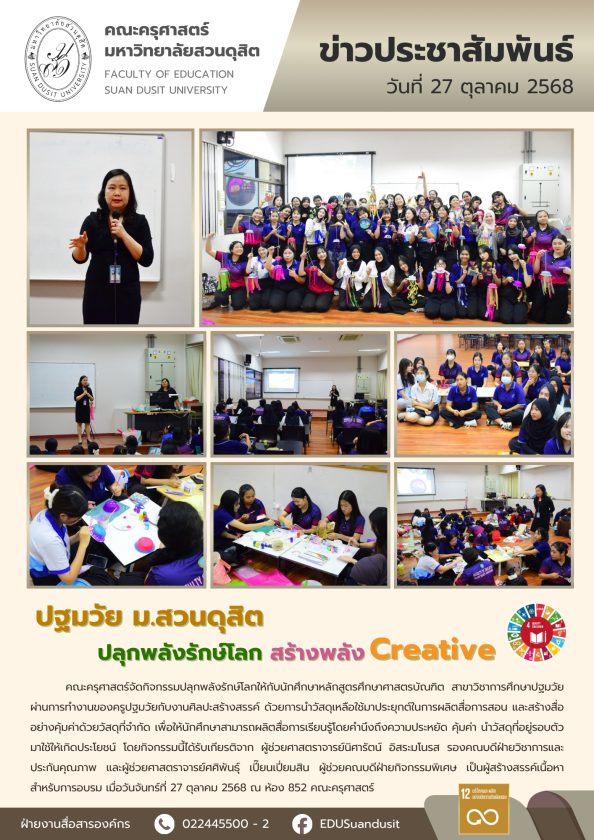 27 ต.ค. 2568 – กิจกรรม “ปลุกพลังรักษ์โลก สร้างพลัง Creative” สำหรับนักศึกษาสาขาวิชาการศึกษาปฐมวัย