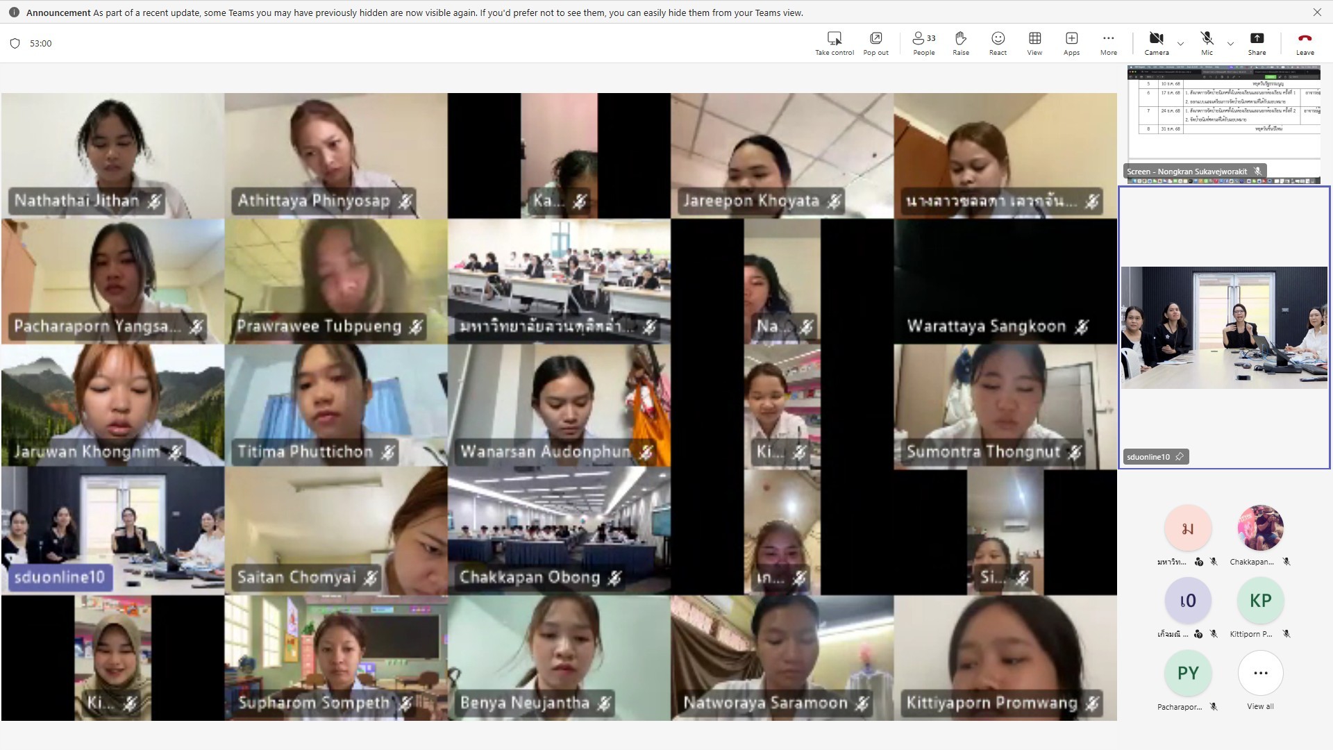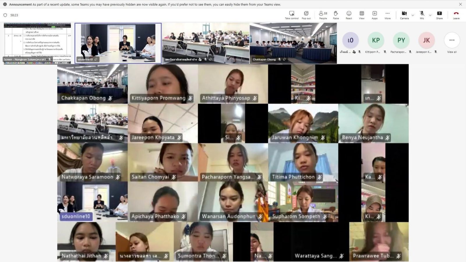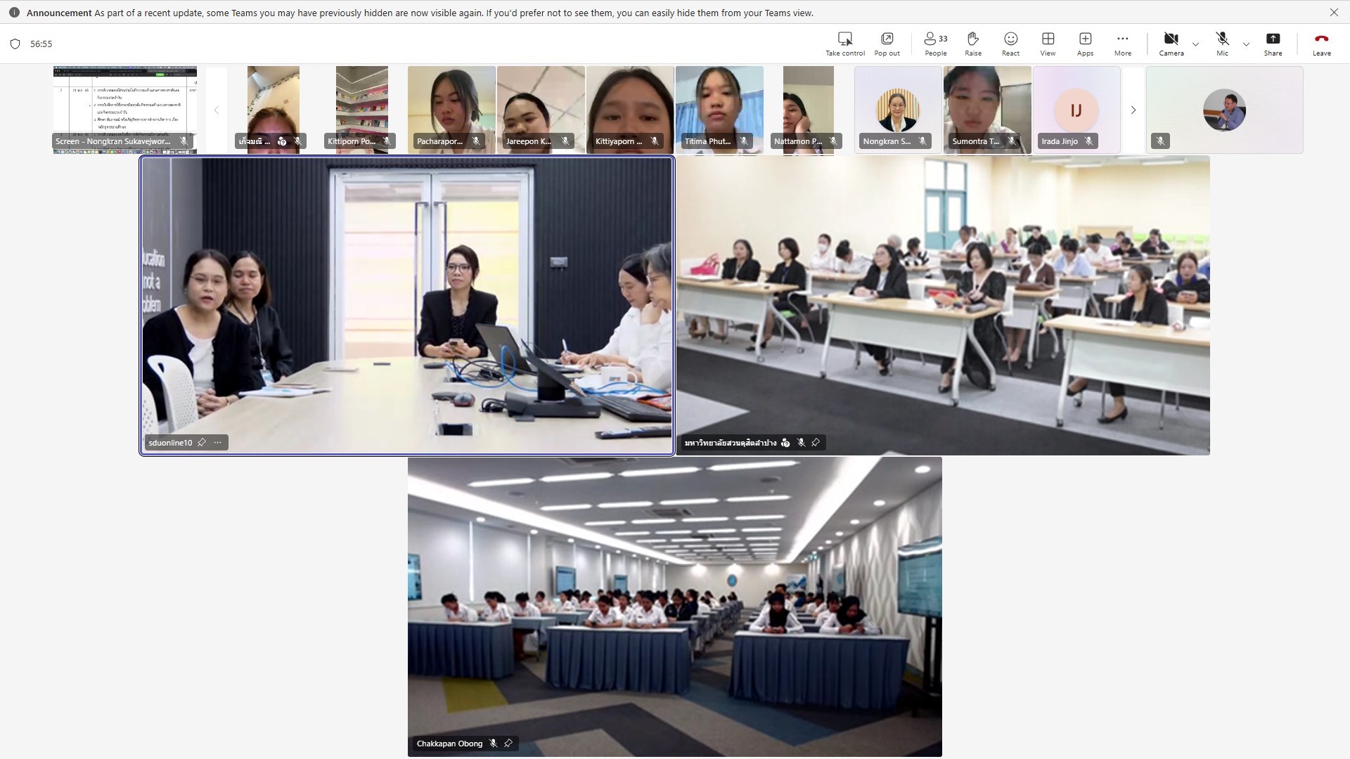 นักศึกษาทุกศูนย์การศึกษาที่เปิดสอนหลักสูตรฯ เข้าร่วมกิจกรรมกันอย่างพร้อมเพรียงประกอบด้วย วิทยาเขตสุพรรณบุรี ศูนย์การศึกษานครนายก และศูนย์การศึกษาลำปาง การบูรณาการการเรียนการสอนข้ามศูนย์การศึกษาผ่านระบบออนไลน์ครั้งนี้ สะท้อนให้เห็นความสามารถในการบริหารจัดการหลักสูตรที่มีประสิทธิภาพและทันสมัย เข้าถึงนักศึกษาได้อย่างทั่วถึง และเป็นการยกระดับมาตรฐานการศึกษาให้เป็นไปในทิศทางเดียวกัน