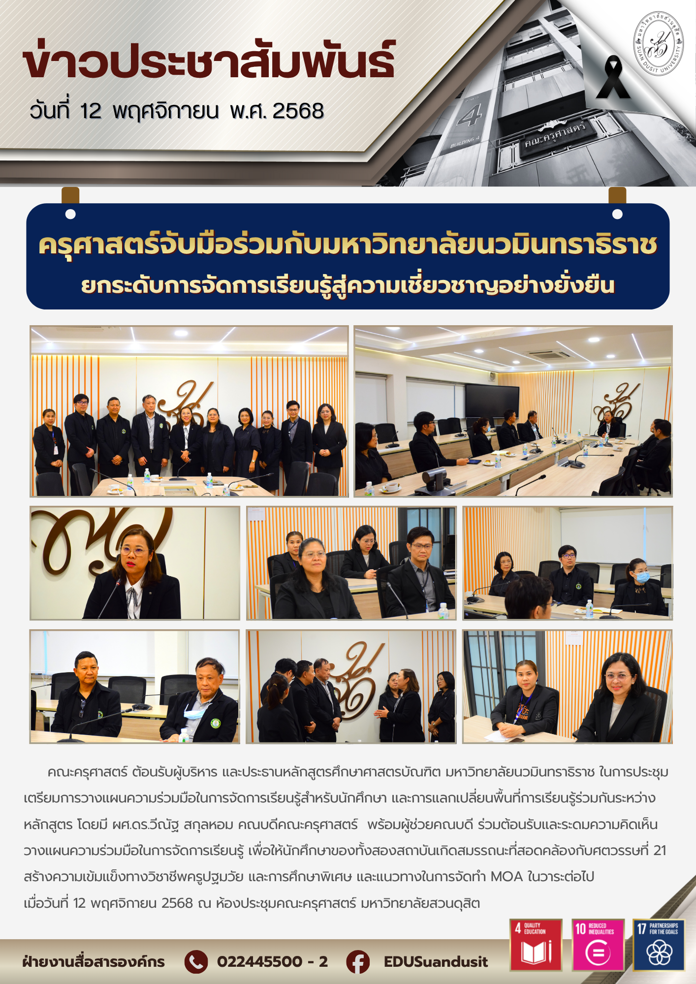 คณะครุศาสตร์ ต้อนรับผู้บริหารและประธานหลักสูตรศึกษาศาสตรบัณฑิต มหาวิทยาลัยนวมินทราธิราช ในการประชุมเตรียมการวางแผนความร่วมมือในการจัดการเรียนรู้สำหรับนักศึกษา และการแลกเปลี่ยนพื้นที่การเรียนรู้ร่วมกันระหว่างหลักสูตร โดยมี ผศ.ดร.วีณัฐ สกุลหอม คณบดีคณะครุศาสตร์ พร้อมผู้ช่วยคณบดีร่วมต้อนรับและระดมความคิดเห็น วางแผนความร่วมมือในการจัดการเรียนรู้ เพื่อให้นักศึกษาของทั้งสองสถาบันเกิดสมรรถนะที่สอดคล้องกับศตวรรษที่ 21 สร้างความเข้มแข็งทางวิชาชีพครูปฐมวัย และการศึกษาพิเศษ และแนวทางในการจัดทำ MOA ในวาระต่อไป เมื่อวันพุธที่ 12 พฤศจิกายน 2568 ณ ห้องประชุมคณะครุศาสตร์ มหาวิทยาลัยสวนดุสิต
