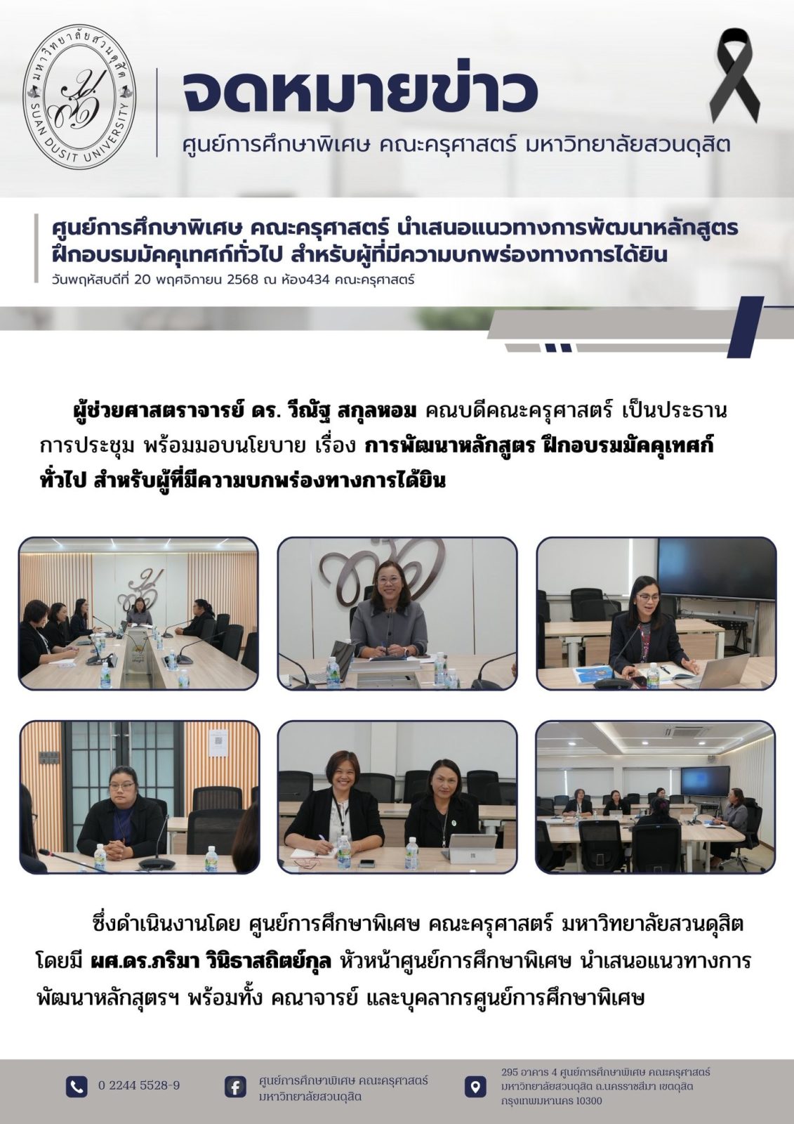 ผู้ช่วยศาสตราจารย์ ดร. วีณัฐ สกุลหอม คณบดีคณะครุศาสตร์ เป็นประธานการประชุม พร้อมมอบนโยบาย เรื่อง การพัฒนาหลักสูตร ฝึกอบรมมัคคุเทศก์ทั่วไป สำหรับผู้ที่มีความบกพร่องทางการได้ยิน ซึ่งดำเนินงานโดย ศูนย์การศึกษาพิเศษ คณะครุศาสตร์ มหาวิทยาลัยสวนดุสิต โดยมี ผศ.ดร.ภริมา วินิธาสถิตย์กุล หัวหน้าศูนย์การศึกษาพิเศษ นำเสนอแนวทางการพัฒนาหลักสุตรฯ พร้อมทั้ง คณาจารย์ และบุคลากรศูนย์การศึกษาพิเศษ เข้าร่วมประชุม เมื่อวันพฤหัสบดีที่ 20 พฤศจิกายน 2568 เวลา 11.00 – 12.30 น. ณ ห้องประชุมครุศาสตร์ 434 คณะครุศาสตร์ มหาวิทยาลัยสวนดุสิต