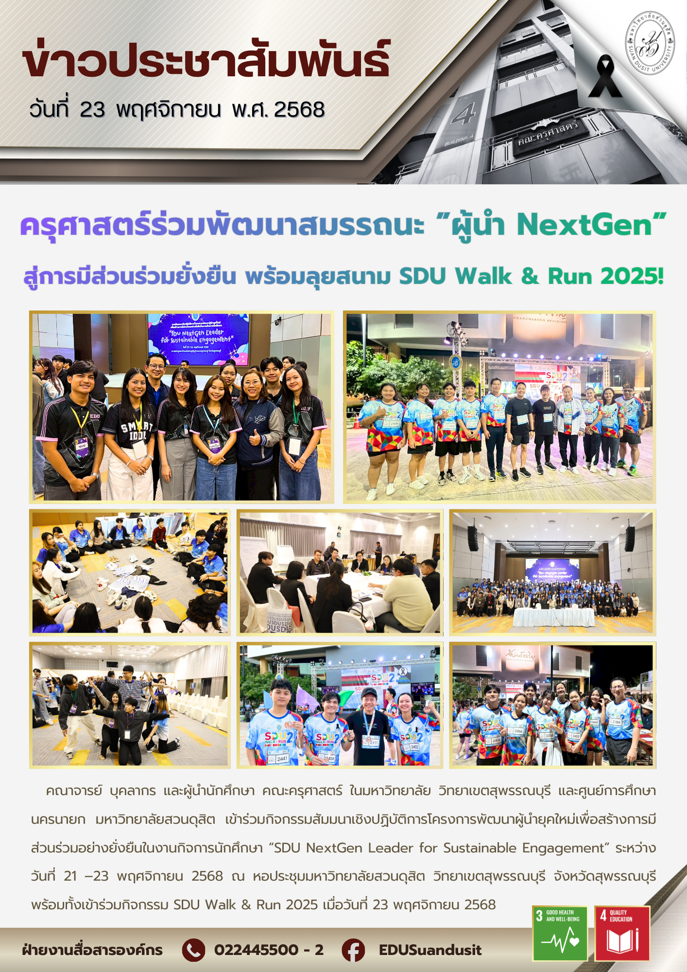 23 พ.ย. 2568 – ครุศาสตร์ร่วมพัฒนาสมรรถนะ “ผู้นำ NextGen” สู่การมีส่วนร่วมอย่างยั่งยืน พร้อมลุย SDU Walk & Run 2025