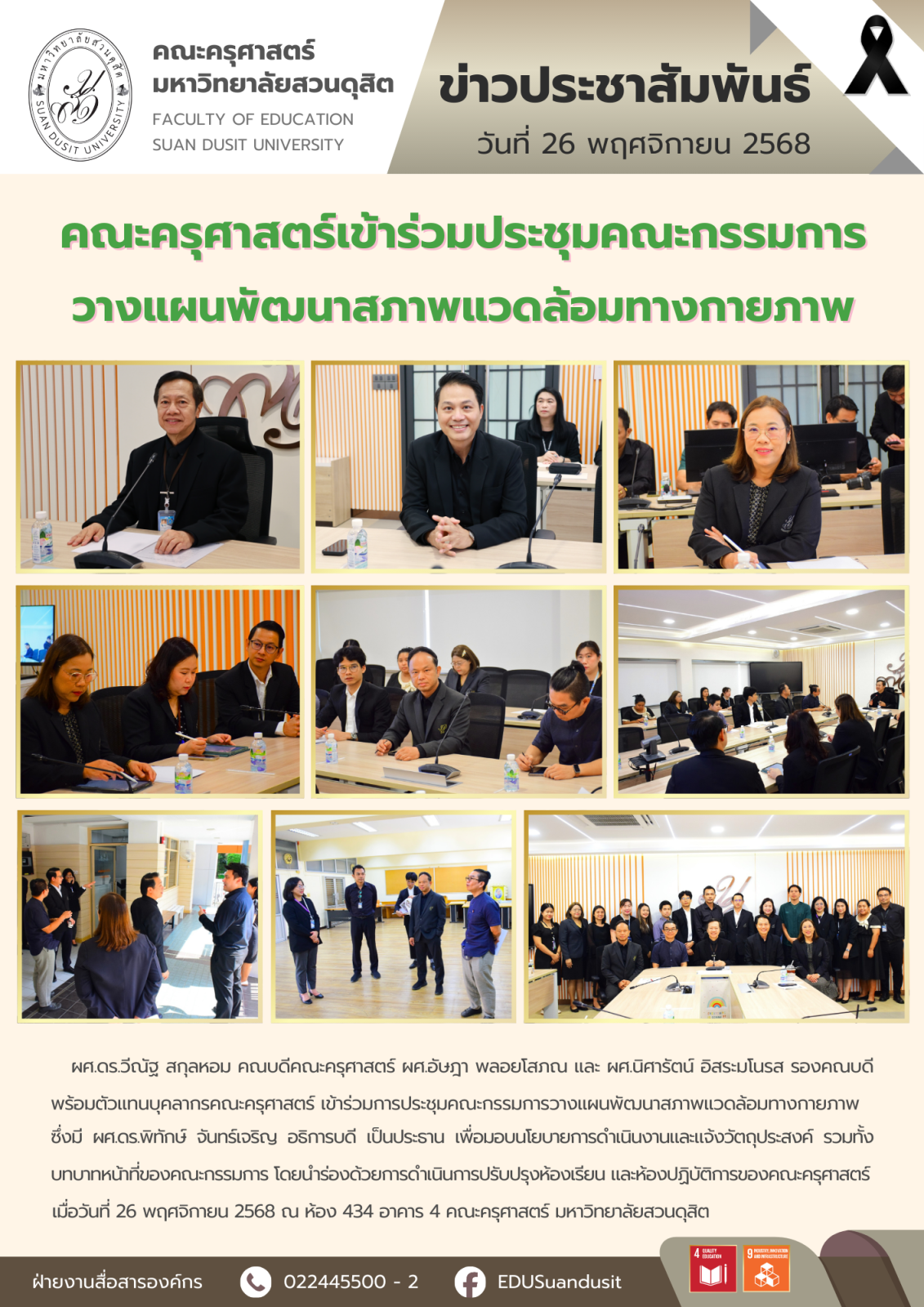 ของคณะกรรมการ โดยนำร่องด้วยการดำเนินการปรับปรุงห้องเรียนและห้องปฏิบัติการของคณะครุศาสตร์ เมื่อวันที่ 26 พฤศจิกายน 2568 ณ ห้อง 434 อาคาร 4 คณะครุศาสตร์ มหาวิทยาลัยสวนดุสิต