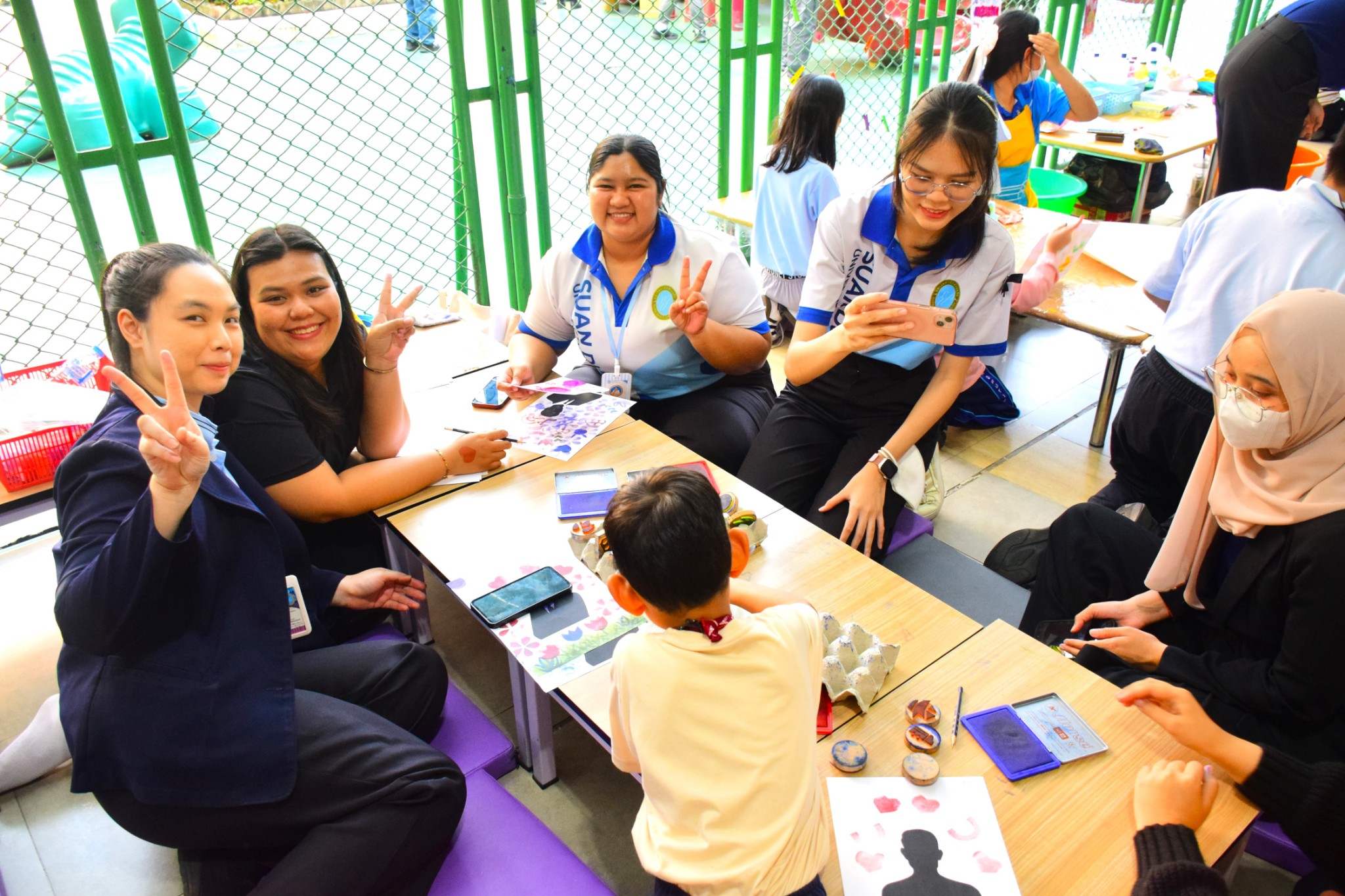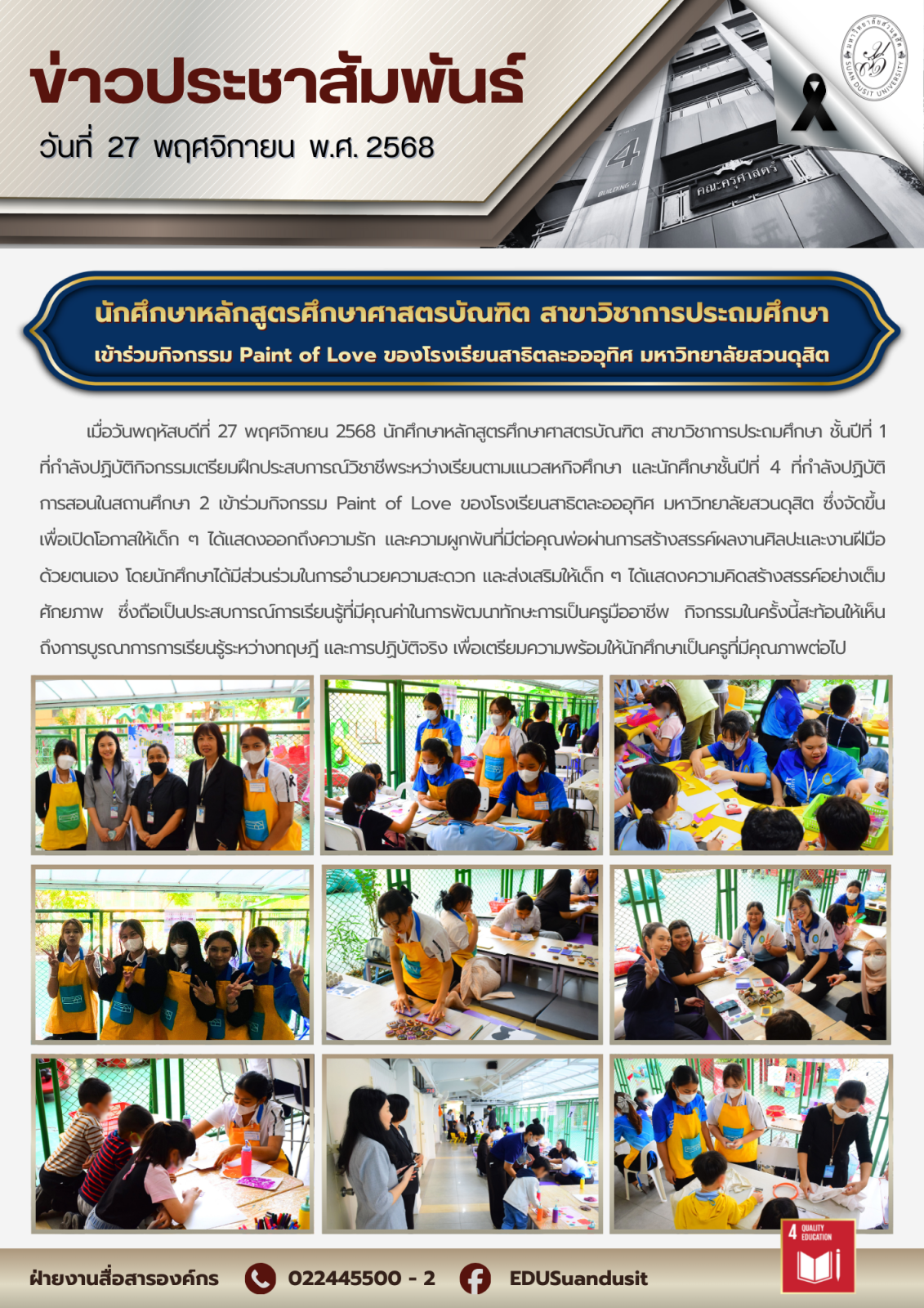 เมื่อวันพฤหัสบดีที่ 27 พฤศจิกายน 2568 นักศึกษาหลักสูตรศึกษาศาสตรบัณฑิต สาขาวิชาการประถมศึกษา ชั้นปีที่ 1 ที่กำลังปฏิบัติกิจกรรมเตรียมฝึกประสบการณ์วิชาชีพระหว่างเรียนตามแนวสหกิจศึกษา และชั้นปีที่ 4 ที่กำลังปฏิบัติการสอนในสถานศึกษา 2 เข้าร่วมกิจกรรม Paint of Love ของโรงเรียนสาธิตละอออุทิศ มหาวิทยาลัยสวนดุสิต ซึ่งจัดขึ้นเพื่อเปิดโอกาสให้เด็ก ๆ ได้แสดงออกถึงความรัก และความผูกพันที่มีต่อคุณพ่อผ่านการสร้างสรรค์ผลงานศิลปะและงานฝีมือด้วยตนเอง โดยนักศึกษาได้มีส่วนร่วมในการอำนวยความสะดวก และส่งเสริมให้เด็ก ๆ ได้แสดงความคิดสร้างสรรค์อย่างเต็มศักยภาพ ซึ่งถือเป็นประสบการณ์การเรียนรู้ที่มีคุณค่าในการพัฒนาทักษะการเป็นครูมืออาชีพ กิจกรรมในครั้งนี้สะท้อนให้เห็นถึงการบูรณาการการเรียนรู้ระหว่างทฤษฎี และการปฏิบัติจริง เพื่อเตรียมความพร้อมให้นักศึกษาเป็นครูที่มีคุณภาพต่อไป
