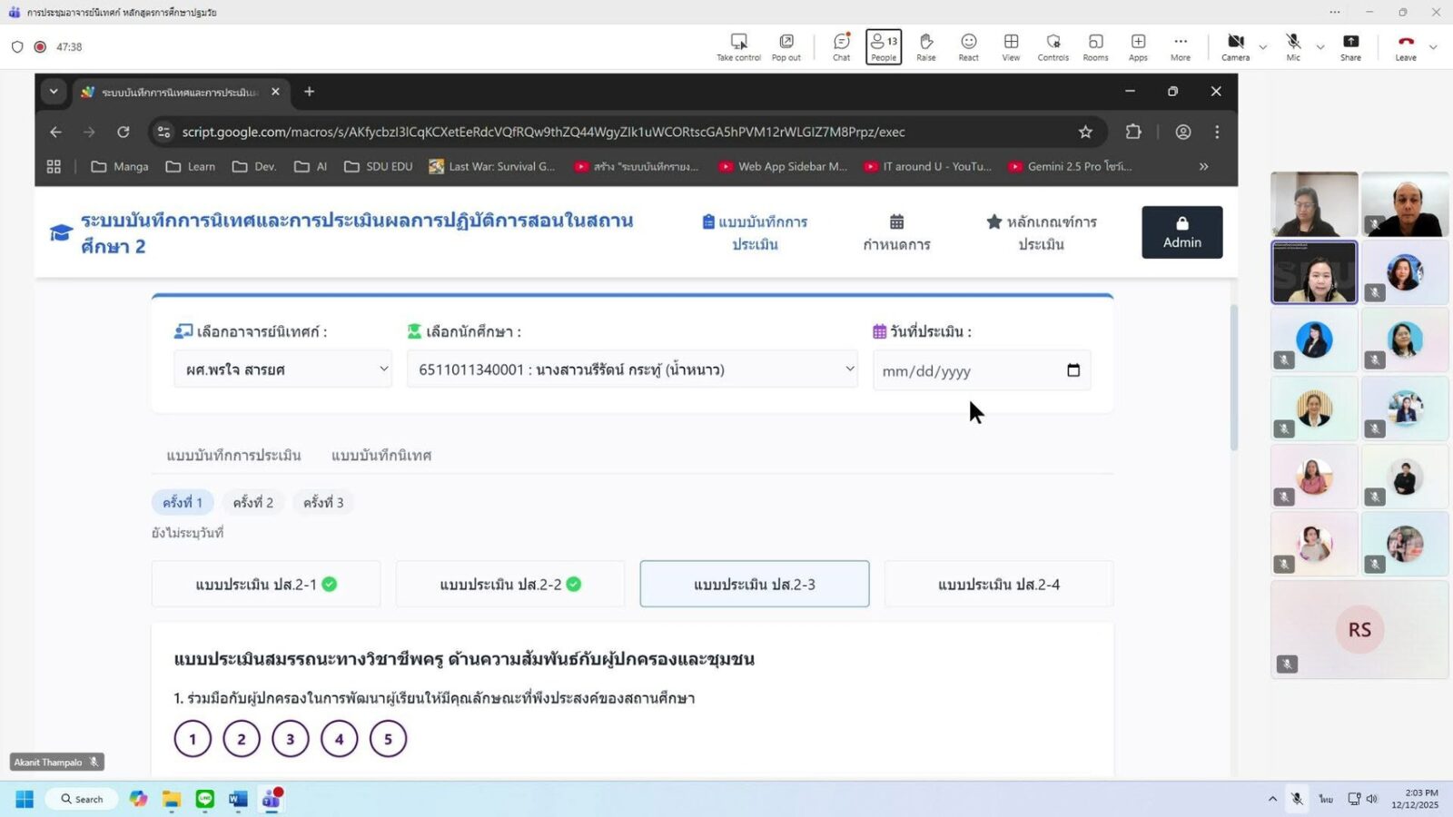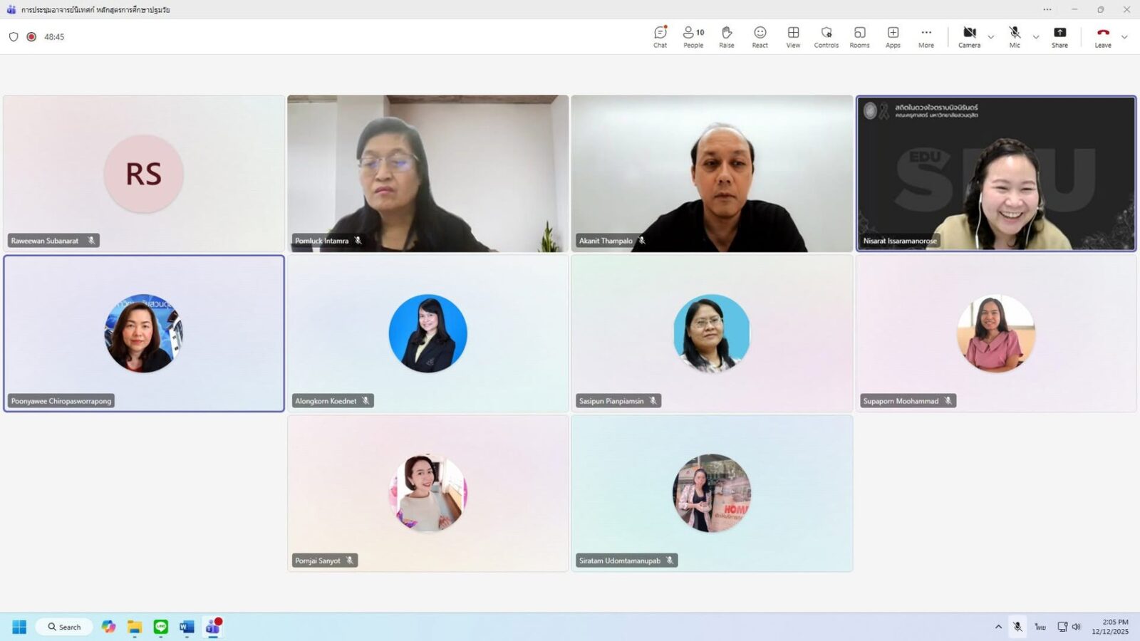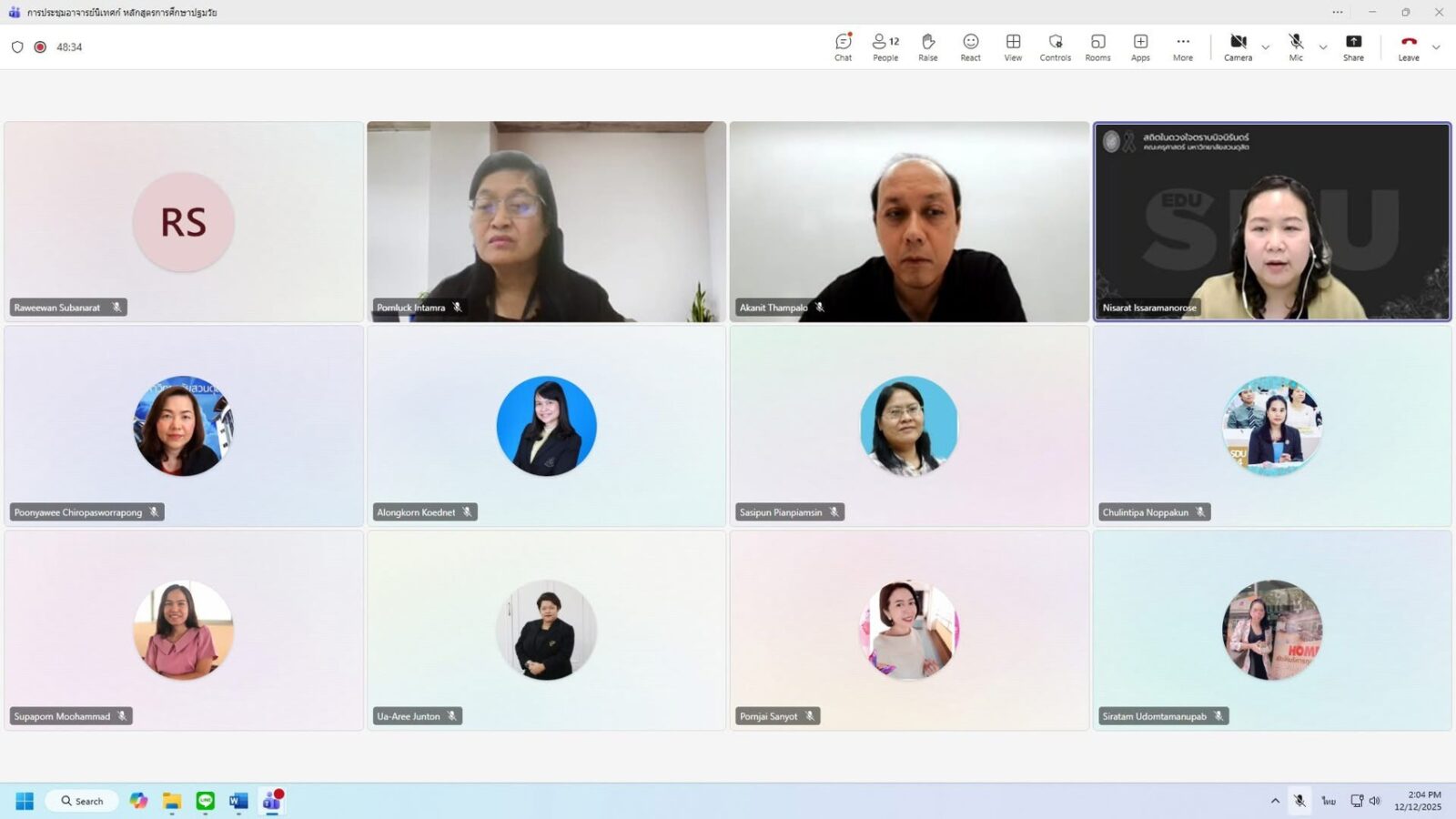 ผู้ช่วยศาสตราจารย์นิศารัตน์ อิสระมโนรส รองคณบดีฝ่ายวิชาการและประกันคุณภาพ คณะครุศาสตร์ เป็นประธานประชุมเตรียมความพร้อมการใช้งานระบบบันทึกการนิเทศและการประเมินการปฏิบัติการสอนในสถานศึกษา 2 ให้กับอาจารย์นิเทศก์ในหลักสูตร เมื่อวันศุกร์ที่ 12 ธันวาคม 2568 เวลา 13.30 – 14.30 น. ออนไลน์ผ่านระบบ MS-Teams
