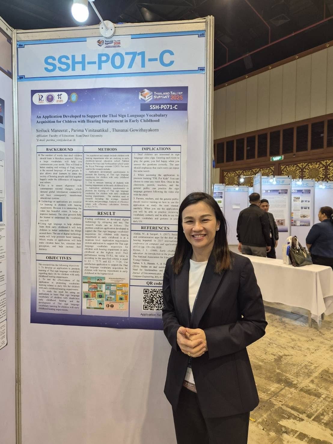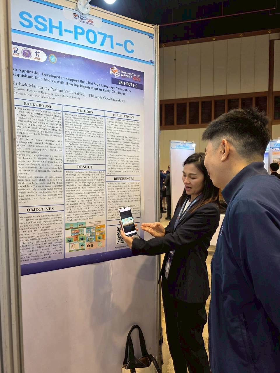 ในงานนี้ ศูนย์การศึกษาพิเศษ มหาวิทยาลัยสวนดุสิต ได้ร่วมนำเสนอผลงานทางวิชาการที่น่าสนใจ โดย ผศ.ดร.ภริมา วินิธาสถิตย์กุล (หัวหน้าศูนย์การศึกษาพิเศษ) ในหัวข้อ “An Application Developed to Support the Thai Sign Language Vocabulary Acquisition for Children with Hearing Impairment in Early Childhood” การเข้าร่วมงานในครั้งนี้ เป็นการส่งเสริมการแลกเปลี่ยนความรู้ สร้างแรงบันดาลใจ และเชื่อมโยงเครือข่ายนักวิจัยรุ่นใหม่และนักวิจัยอาวุโสในระบบ ววน. ซึ่งเป็นกลไกสำคัญในการขับเคลื่อนการวิจัยและพัฒนาประเทศในอนาคต!