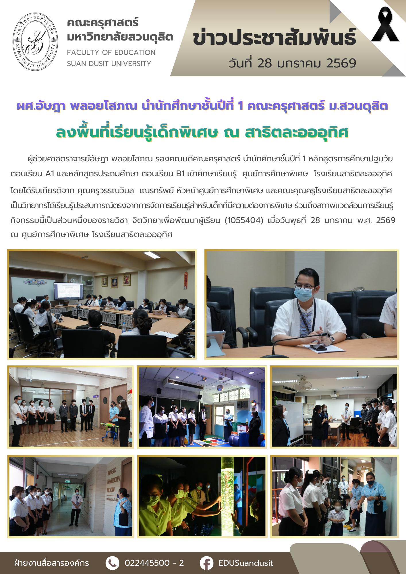 ผู้ช่วยศาสตราจารย์อัษฎา พลอยโสภณ รองคณบดีคณะครุศาสตร์ นำนักศึกษาชั้นปีที่ 1 หลักสูตรการศึกษาปฐมวัย ตอนเรียน A1 และหลักสูตรประถมศึกษา ตอนเรียน B1 เข้าศึกษาเรียนรู้ศูนย์การศึกษาพิเศษ โรงเรียนสาธิตละอออุทิศ โดยได้รับเกียรติจาก คุณครูวรรณวิมล เณรทรัพย์ หัวหน้าศูนย์การศึกษาพิเศษ และคณะคุณครูโรงเรียนสาธิตละอออุทิศเป็นวิทยากร ได้เรียนรู้ประสบการณ์ตรงจากการจัดการเรียนรู้สำหรับเด็กที่มีความต้องการพิเศษ รวมถึงสภาพแวดล้อมการเรียนรู้ กิจกรรมนี้เป็นส่วนหนึ่งของรายวิชา จิตวิทยาเพื่อพัฒนาผู้เรียน (1055404) เมื่อวันพุธที่ 28 มกราคม พ.ศ. 2569 ณ ศูนย์การศึกษาพิเศษ โรงเรียนสาธิตละอออุทิศ