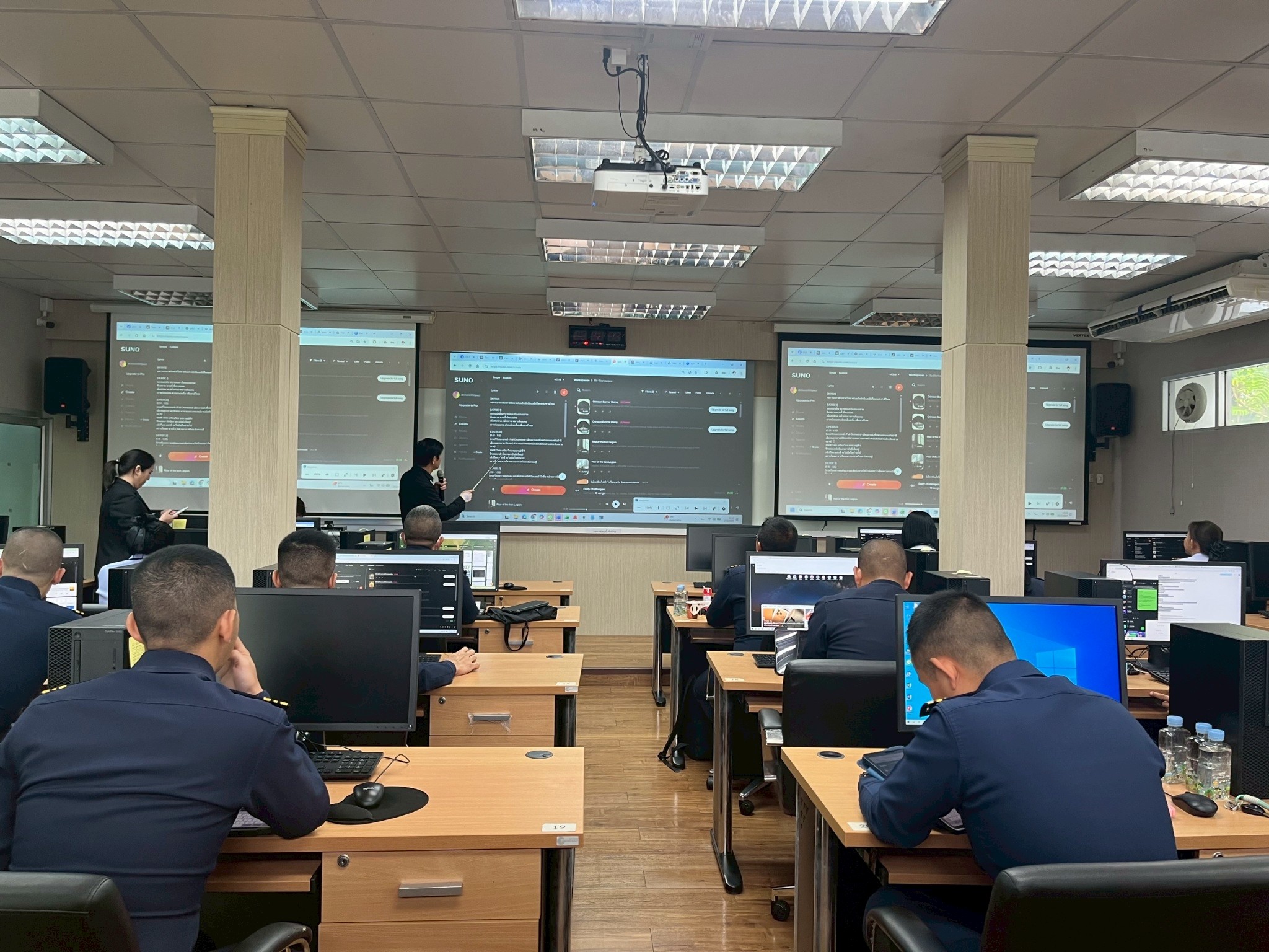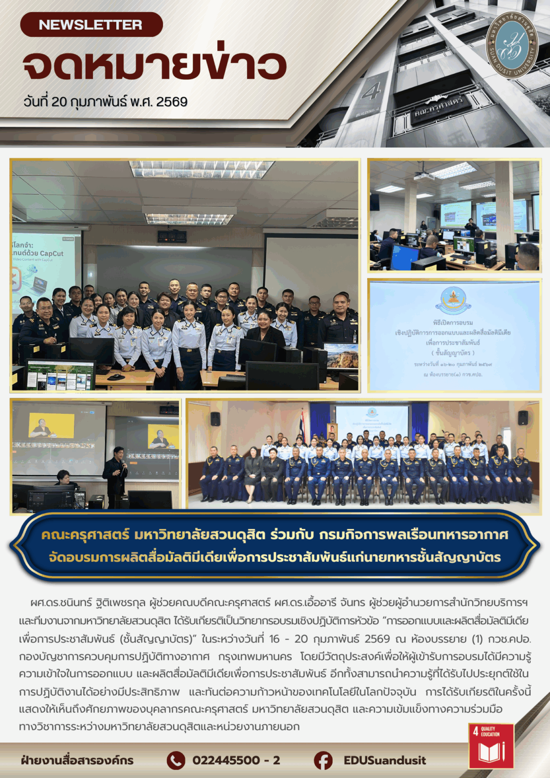 ผศ.ดร.ชนินทร์ ฐิติเพชรกุล ผู้ช่วยคณบดีคณะครุศาสตร์ ผศ.ดร.เอื้ออารี จันทร ผู้ช่วยผู้อำนวยการสำนักวิทยบริการฯ และทีมงานจากมหาวิทยาลัยสวนดุสิต ได้รับเกียรติเป็นวิทยากรอบรมเชิงปฏิบัติการหัวข้อ “การออกแบบและผลิตสื่อมัลติมีเดียเพื่อการประชาสัมพันธ์ (ชั้นสัญญาบัตร)” ในระหว่างวันที่ 16 – 20 กุมภาพันธ์ 2569 ณ ห้องบรรยาย (1) กวช.คปอ. กองบัญชาการควบคุมการปฏิบัติทางอากาศ กรุงเทพมหานคร โดยมีวัตถุประสงค์เพื่อให้ผู้เข้ารับการอบรมได้มีความรู้ ความเข้าใจในการออกแบบ และผลิตสื่อมัลติมีเดียเพื่อการประชาสัมพันธ์ อีกทั้งสามารถนำความรู้ที่ได้รับไปประยุกต์ใช้ในการปฏิบัติงานได้อย่างมีประสิทธิภาพ และทันต่อความก้าวหน้าของเทคโนโลยีในโลกปัจจุบัน การได้รับเกียรติในครั้งนี้แสดงให้เห็นถึงศักยภาพของบุคลากรคณะครุศาสตร์ มหาวิทยาลัยสวนดุสิต และความเข้มแข็งทางความร่วมมือทางวิชาการระหว่างมหาวิทยาลัยสวนดุสิตและหน่วยงานภายนอก