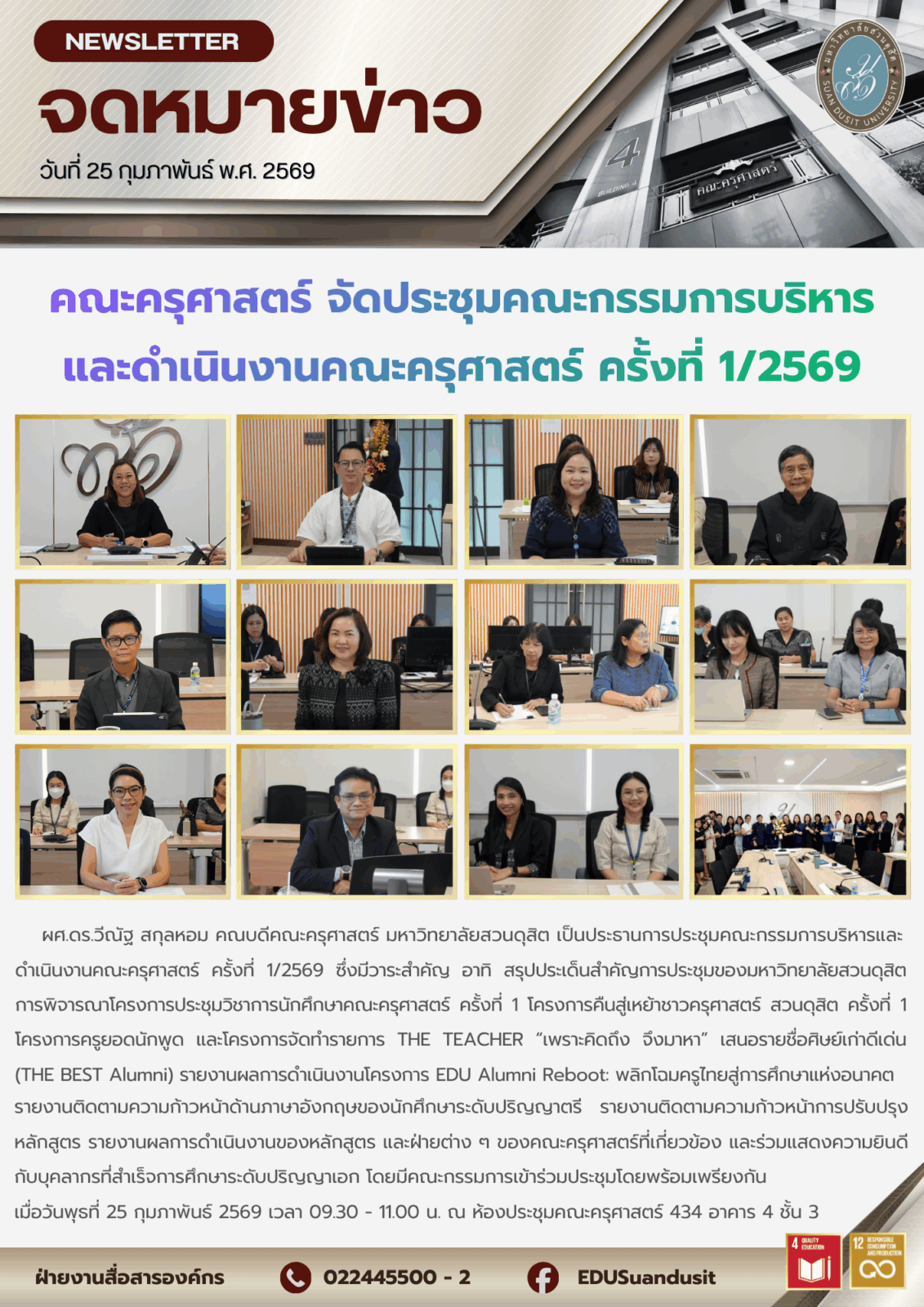 ผศ.ดร.วีณัฐ สกุลหอม คณบดีคณะครุศาสตร์ มหาวิทยาลัยสวนดุสิต เป็นประธานการประชุมคณะกรรมการบริหารและดำเนินงานคณะครุศาสตร์ ครั้งที่ 1/2569 ซึ่งมีวาระสำคัญ อาทิ สรุปประเด็นสำคัญการประชุมของมหาวิทยาลัยสวนดุสิต การพิจารณาโครงการประชุมวิชาการนักศึกษาคณะครุศาสตร์ ครั้งที่ 1 โครงการคืนสู่เหย้าชาวครุศาสตร์ สวนดุสิต ครั้งที่ 1 โครงการครูยอดนักพูด และโครงการจัดทำรายการ THE TEACHER “เพราะคิดถึง จึงมาหา” เสนอรายชื่อศิษย์เก่าดีเด่น (THE BEST Alumni) รายงานผลการดำเนินงานโครงการ EDU Alumni Reboot: พลิกโฉมครูไทยสู่การศึกษาแห่งอนาคต รายงานติดตามความก้าวหน้าด้านภาษาอังกฤษของนักศึกษาระดับปริญญาตรี รายงานติดตามความก้าวหน้าการปรับปรุงหลักสูตร รายงานผลการดำเนินงานของหลักสูตร และฝ่ายต่าง ๆ ของคณะครุศาสตร์ที่เกี่ยวข้อง และร่วมแสดงความยินดีกับบุคลากรที่สำเร็จการศึกษาระดับปริญญาเอก โดยมีคณะกรรมการเข้าร่วมประชุมโดยพร้อมเพรียงกัน เมื่อวันพุธที่ 25 กุมภาพันธ์ 2569 เวลา 09.30 – 11.00 น. ณ ห้องประชุมคณะครุศาสตร์ 434 อาคาร 4 ชั้น 3