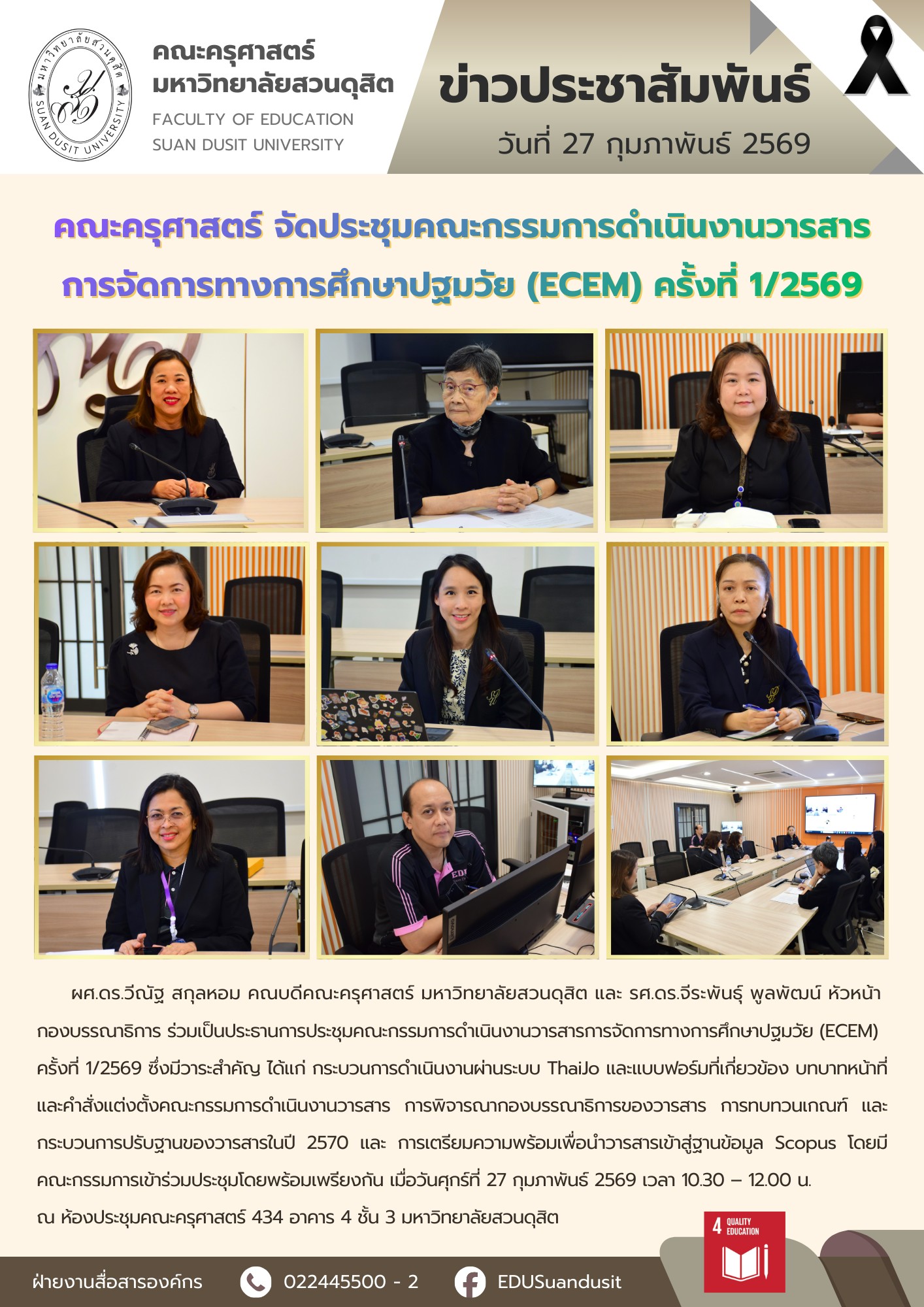 ผศ.ดร.วีณัฐ สกุลหอม คณบดีคณะครุศาสตร์ มหาวิทยาลัยสวนดุสิต และ รศ.ดร.จีระพันธุ์ พูลพัฒน์ หัวหน้ากองบรรณาธิการ ร่วมเป็นประธานการประชุมคณะกรรมการดำเนินงาน วารสารการจัดการทางการศึกษาปฐมวัย (ECEM) ครั้งที่ 1/2569 ซึ่งมีวาระสำคัญ ได้แก่ กระบวนการดำเนินงานผ่านระบบ ThaiJo และแบบฟอร์มที่เกี่ยวข้อง บทบามหน้าที่และคำสั่งแต่งตั้งคณะกรรมการดำเนินงานวารสาร การพิจารณากองบรรณาธิการของวารสาร การทบทวนเกณฑ์ และกระบวนการปรับฐานของวารสารในปี 2570 และการเตรียมความพร้อมเพื่อนำวารสารเข้าสู่ฐานข้อมูล Scopus โดยมีคณะกรรมการเข้าร่วมประชุมโดยพร้อมเพรียงกัน เมื่อวันศุกร์ที่ 27 กุมภาพันธ์ 2569 เวลา 10.30 – 12.00 น. ณ ห้องประชุม 434 อาคาร 4 ชั้น 3 คณะครุศาสตร์ มหาวิทยาลัยสวนดุสิต