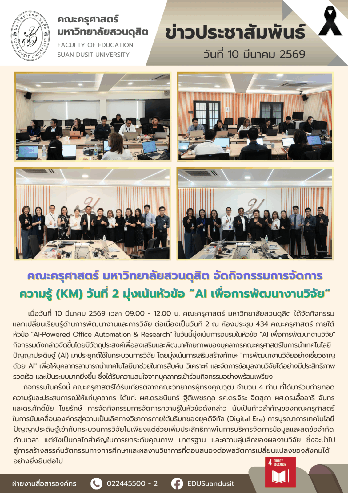 10 มี.ค. 2569 – คณะครุศาสตร์ มหาวิทยาลัยสวนดุสิต จัดกิจกรรมการจัดการความรู้ (KM) วันที่ 2 มุ่งเน้นหัวข้อ “AI เพื่อการพัฒนางานวิจัย”