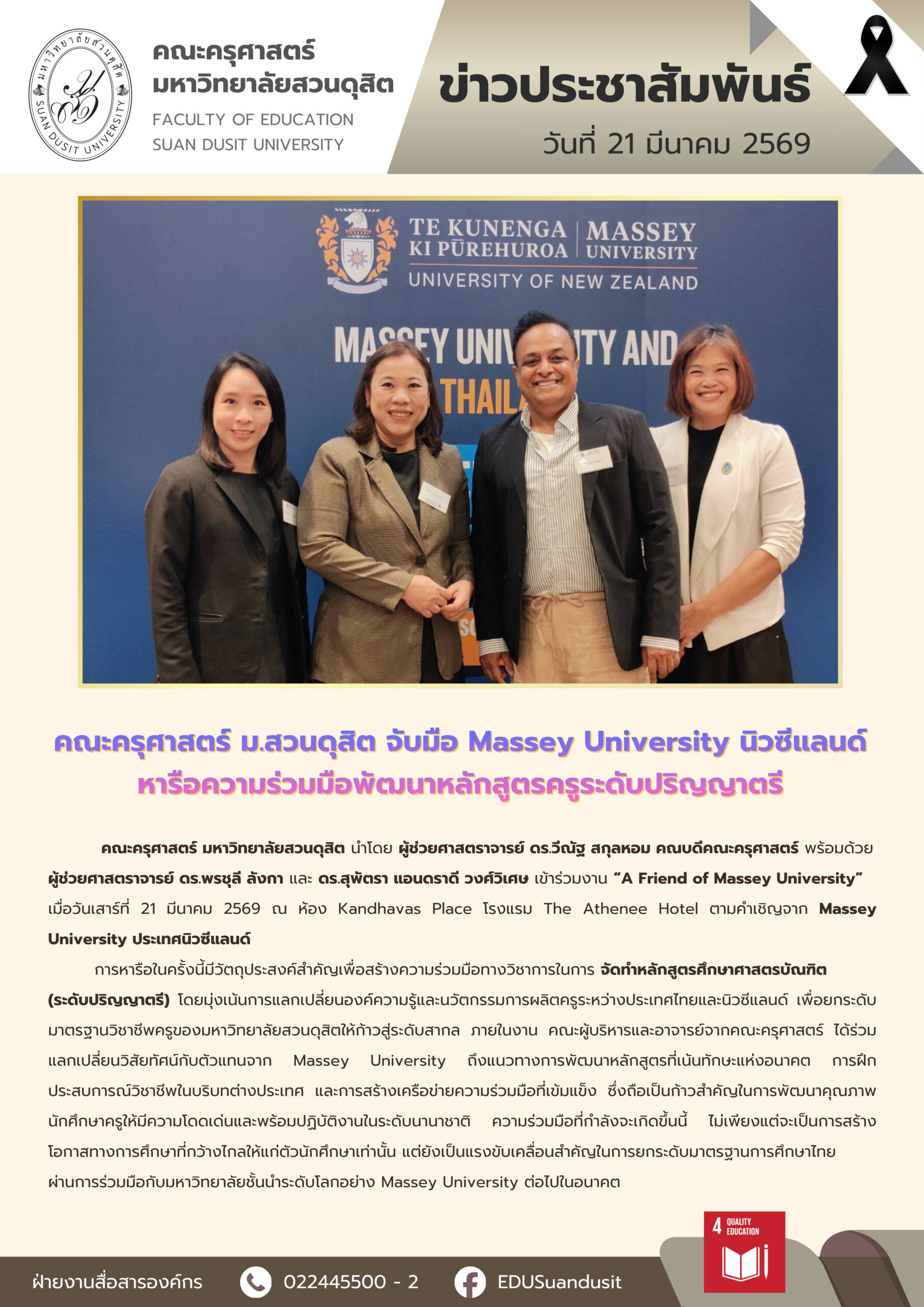 คณะครุศาสตร์ มหาวิทยาลัยสวนดุสิต นำโดย ผู้ช่วยศาสตราจารย์ ดร.วีนัฐ สกุลหอม คณบดีคณะครุศาสตร์ พร้อมด้วย ผู้ช่วยศาสตราจารย์ ดร.พรชุลี ลังกา และ ดร.สุพัตรา แอนดราดี วงศ์วิเศษ เข้าร่วมงาน “A Friend of Massey University” เมื่อวันเสาร์ที่ 21 มีนาคม 2569 ณ ห้อง Kandhavas Place โรงแรม The Athenee Hotel ตามคำเชิญจาก Massey University ประเทศนิวซีแลนด์